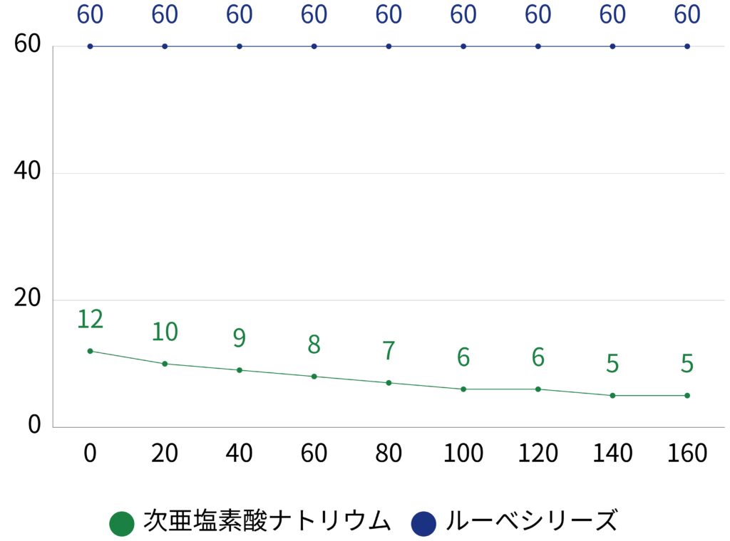 ルーベ主原料のジクロロイソシアヌル酸は、安定した結合のため、塩素失活がほとんどなく、適正な保管であれば1年経過でもほぼ99%の塩素濃度を保持できます。