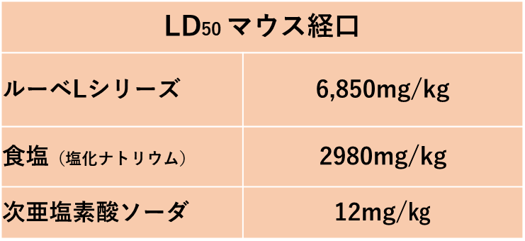 次亜塩素酸は液体タイプなので使い勝手は良いのですが、誤って誤飲してしまう事故も発生していています。粉末タイプのルーべはそのような事がなくまた、LD50 6,850mg/㎏と高い安全性も維持しています。
